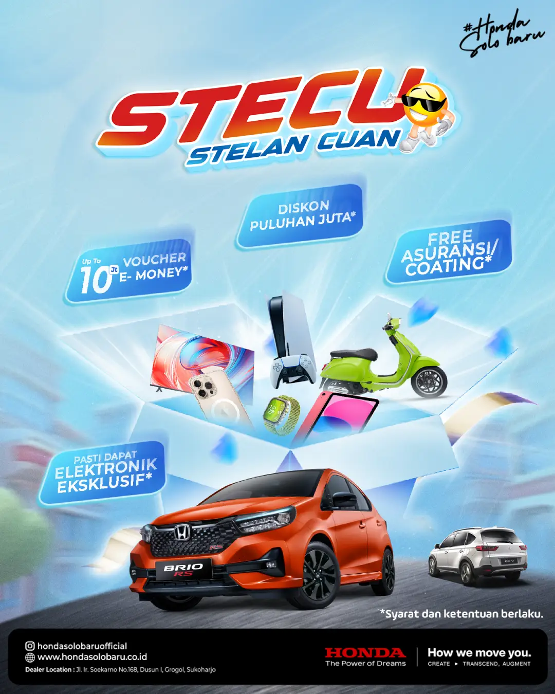 Bulan September 2025 ini, Honda Solo Baru kembali menghadirkan kejutan besar yang bikin siapa pun ingin segera punya mobil baru. Lewat program STECU (Stelan Cuan Mobil Baru), Anda bisa menikmati berbagai keuntungan spektakuler mulai dari diskon puluhan juta rupiah, voucher E-Money hingga 10 juta rupiah, hingga hadiah elektronik eksklusif yang super mewah. Promo ini hanya berlaku dalam periode terbatas, jadi jangan sampai kelewatan.